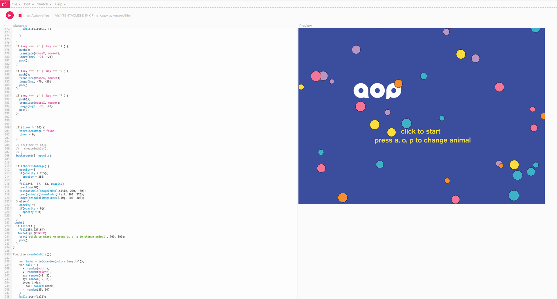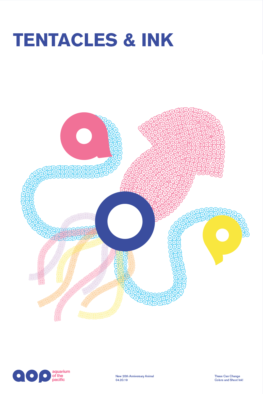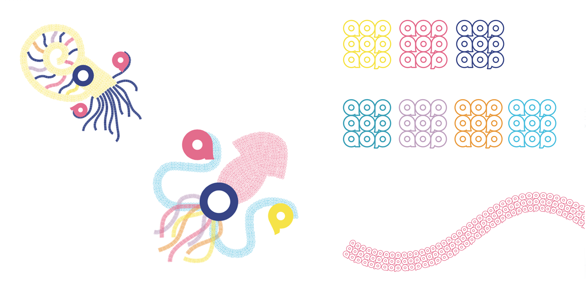 The pattern for aop logo is used for the illustration. It evokes a tentacle, and each of the sea animal characters have a,o,p with them.